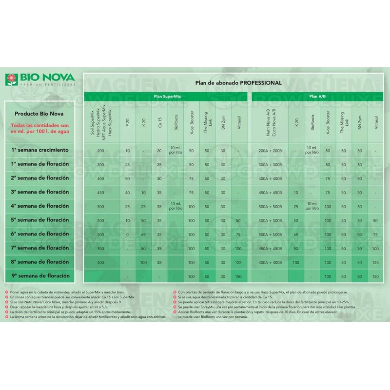Bio Nova recomienda mezclar cada nutriente directamente en el agua, la dosificación va de 1 mililitro de cada uno por litro de agua en las primeras semanas, hasta 2,3 mililitros de cada bote por litro de agua cuando avanza el cultivo.