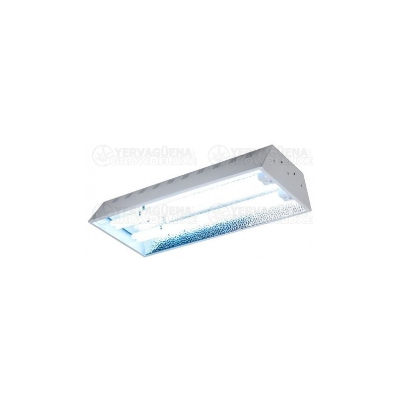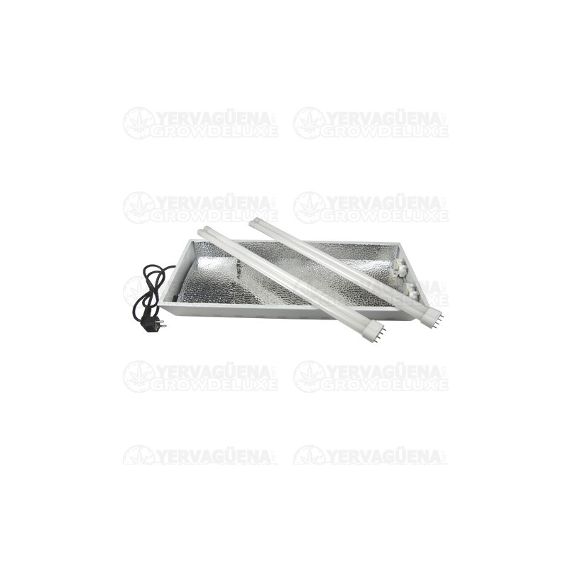 Este kit de 110W se sirve preparado para su uso, lleva una pantalla reflectante stuco de alta reflexión, con dos balastros electrónicos, dos casquillos y dos fluorescentes dobles de bajo consumo con el espectro adecuado para que a tus plantas no les falte nada durante el enraizado y el crecimiento, solo tienes que conectarlo a la red eléctrica.