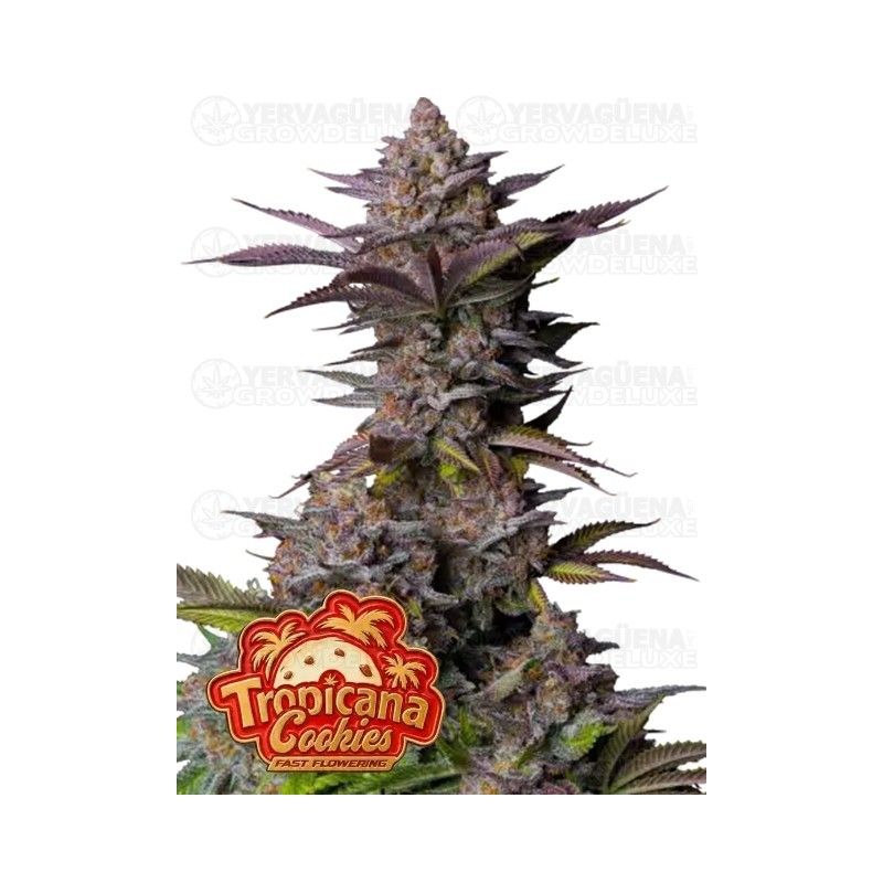 La Tropicana Cookies Fast Flowering de Fast Buds es una variedad feminizada fotoperiódica diseñada para cultivadores que buscan resultados rápidos sin renunciar a calidad. Gracias a su genética Tropicana Cookies x Tropicana Cookies Auto, ofrece una floración ultrarrápida de solo 6-7 semanas y un nivel de THC que puede alcanzar el 28%, ideal para quienes buscan efectos intensos. Esta genética destaca por producir cogollos densos y cubiertos de resina con colores oscuros y púrpuras espectaculares. Además, su perfil de terpenos combina notas cítricas dulces y tropicales que llenan el cultivo de aroma desde las primeras semanas de floración.
